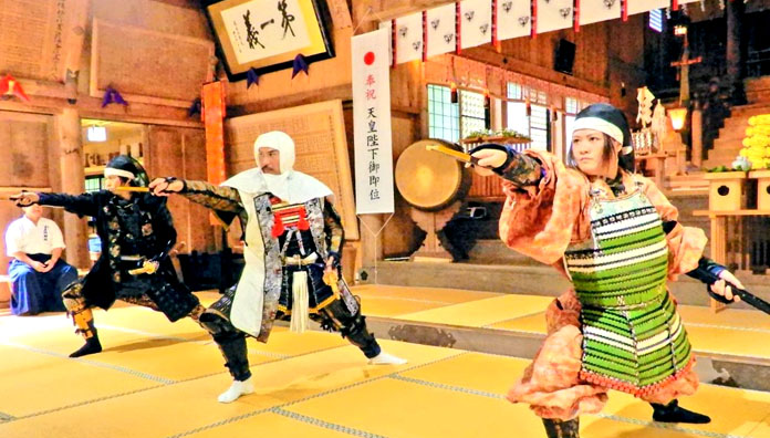 神事終了後には拝殿内にて恒例となっている長尾流躰術の演武披露、そしてその終了後に合わせ、神社境内においては我ら武将隊の奉納演武も披露していた。