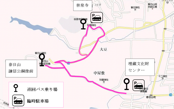 上記期間中は、臨時駐車場から春日山謙信公銅像前までを巡回する無料シャトルバスを運行しますので、ご利用ください。