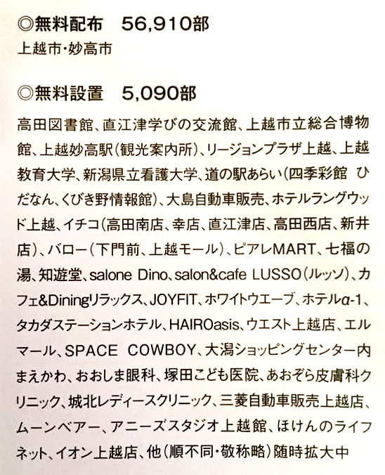 上越・妙高一部地域の各戸配布(約56000部)と公共施設やスーパー等に設置(約5000部)されます。