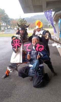 やっぱり、大きな大きな声で、元気な笑顔をお届けいたします(のつもりで…)、と言いながら、この秋初めて手がかじかんでしまった(動いて動いてだんだんほんわかして来ましたが…)「越後上越上杉おもてなし武将隊」足軽組頭、十吾郎ですっ!