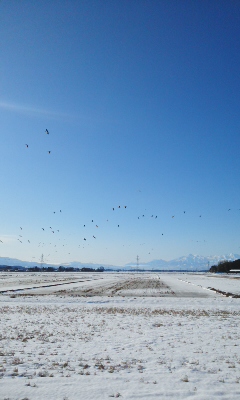 十「そして、越冬のため里帰り中のコハクチョウやオオヒシクイなどの渡り鳥さん!長い筒を携えた写真家のみなさまが県外からもいらっしゃいます。望遠鏡などの武器があれば拙者のガラ携でも豆粒にならずに撮れると思いまするが、あの大感動の鳴き声は心に♪ぱしゃりと¨おもいっきり記憶されます。最高にござりまする〜」