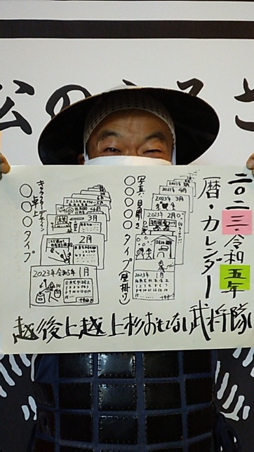 「か、感嘆でしたか~(汗)!さておき、本日は゛カレンダーの日!明治5年のきょう(旧暦)が、太陽暦の採用によって明治6(1873)年1月1日となったことから来ているそうです…。ふるさと越後は新潟県上越市を大発信したい我ら越後上越上杉おもてなし武将隊!来年!2023年カレンダーに、たくさんのご予約をいただきました。写真を活かした壁掛け型!キャラクターデザインの卓上型!の二種類です。例年と違うのは…。お、お楽しみにです~」