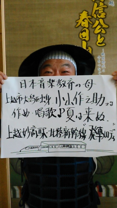 「我ら越後上越上杉おもてなし武将隊!武将隊YouTubeチャンネルの企画!十吾郎156秒劇場!はたまた、公式Twitterの企画!十吾郎15秒劇場!手描きの文字・活字や絵が踊る特製フリップ~を使っています。な、何度も、見てくださりませ~(汗)!」