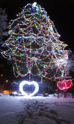 「我らがふるさと越後は新潟県上越市、高田城址は高田公園から東へ、国道405号線を山里に進むと突如の大きな大きな輝きです!恒例となりました牧区の¨縁結びジャンボツリー!今月25日までの取り組みはハートの絵馬も奉納出来まする!ライトアップ〜された様は冷たい空気に白い雪が合います。はいっ、名カメラマンもいい感じに撮れましたぞ〜」