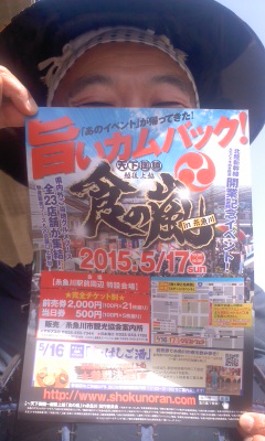 十「本日は、お隣の糸魚川駅前で北陸新幹線開業などを記念した¨越後上越食の嵐(らん)¨が開催されます。糸魚川のブラック、妙高のレッド、そして我らが上越のホワイト、上越地域の黒赤白のご当地焼きそばを繋ぐ¨三国同盟、天下御免ならぬ¨三色同麺、天下御麺の¨食の催しも四年目にござりまする~!」