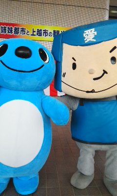 「(追記)青春の青色は大好きですっ!お天気を願いつつ…。我らが上越忠義隊けんけんずの兼続くんと静岡市清水区の広報担当主任に昇格したシズラさん、ゆるキャラのみなさんにも会えるといいですな〜」