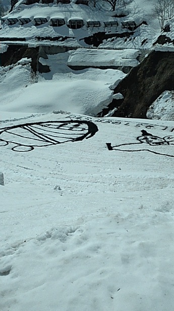 高田城址公園観桜会の準備が始まっています。一方、まだまだ雪におおわれている田んぼに燻炭で「はるのしらせ」の文字も…。雪国山里の暮らし!強いです。十吾郎(礼)