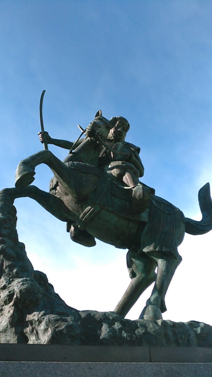 「どうぞ~!銅像と、お決まりですが、春日山城跡のシンボルなる謙信公銅像と我らが本陣、謙信公と春日山城展゛絶賛開催中の上越市埋蔵文化財センター前の゛昨日は冷たい雨の中ときおり青空に映えた馬上謙信公銅像を見に、紅葉は後半戦でも遺構と相まって゛ほんにほんに大感動の春日山に、ぜひ入らしてくださりませ~」