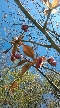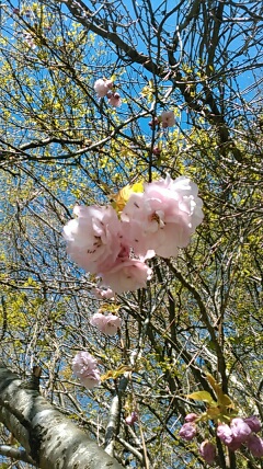 「花のまち上越!五智公園の里山はヤエザクラが咲き始めた。アリたちも花に集まっていました。みな生きています!」
