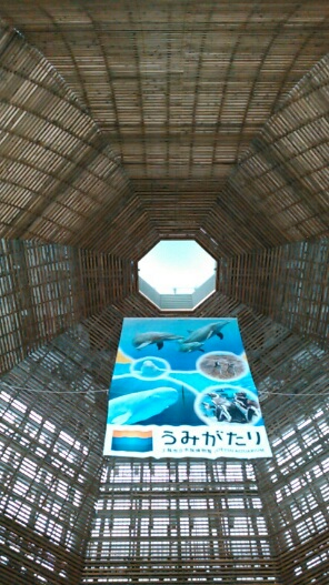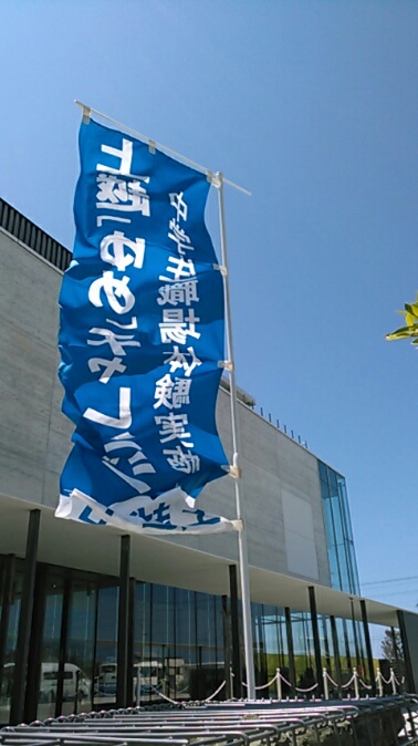 ※越後杉がふんだんに使われている上越妙高駅の東口もてなしドーム!大きな懸垂幕が架かる上越市立水族博物館うみがたり!先日、青いのぼり旗が日本海からの風に揺れていました。中学生さんの職場体験が行われているようです!十吾郎(礼)