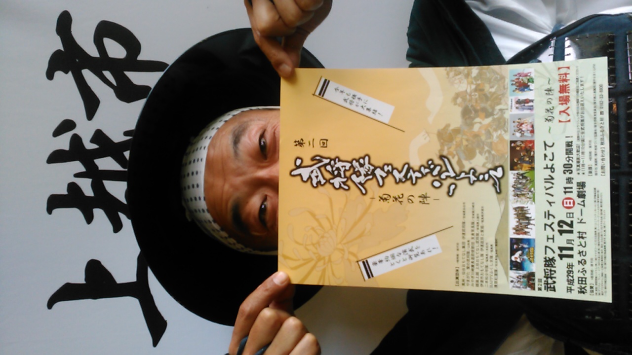 「11月11日は、ほんに゛い~っぱい記念日がありまするので、拙者が気になるものを…。我らがふるさと越後は新潟の県北、鮭のまち村上ならではの゛鮭の日!そして、最終戦まで熱く熱くがんばれ~新潟!サッカーの日!さらに、お写真を撮る際は、はいチーズ~!いざ出陣~!とは関係ないようですが大好きな゛チーズの日!はたまた、世界平和記念日から゛おりがみの日!ち~と不器用で短気で頭でっかちな拙者は折り鶴は苦手にござりまするが~」