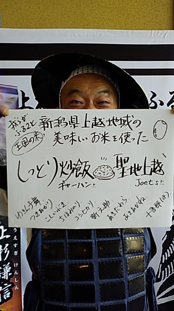 「上越地域の美味しいお米を使った゛しっとり炒飯!聖地上越!!先日、試食させていただきました。卵も玉ねぎもいっぱいで、ほんにしっとり!新たな感覚うんまかったです!拙者が作れば、べとべと炒飯になってしまいまする~(汗)!」