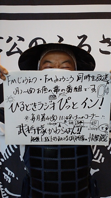 ※今月から新たな番組になりました。FMじょうえつ・FMみょうこう同時生放送!ひるどきラジオぴっとイン!毎月第4金曜日お昼前のコーナーは゛武将隊かわらばん!ふるさと越後は新潟県上越市のあれこれを、我ら武将隊の情報を、拙者のそれも、しゃべり倒しまする~(汗)!十吾郎(礼)