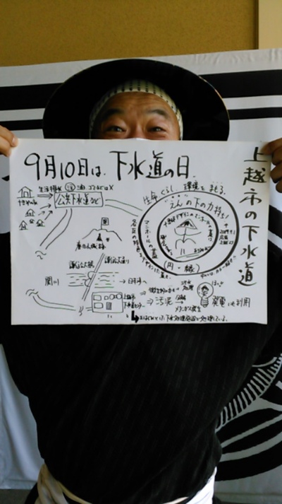 「さ、さておき、本日は゛下水道の日!台風の襲来が多い時期で浸水対策も担う下水道を広く情報発信するのに最適であることから選ばれ、下水道の整備促進に向けて理解と協力を呼びかけようと前後一週間に様々な行事が行われるそうです…。なれば!ふるさと越後は新潟県上越市を大発信したい我ら越後上越上杉おもてなし武将隊は本日!月一定期公演゛春日山城おもてなし演武です。そして、動画公開の企画のひとつ゛十吾郎156秒劇場!マンホールの蓋を取り上げて紹介しています映像も、大、大宣伝してくれたりしたら照れてしまいまする~」