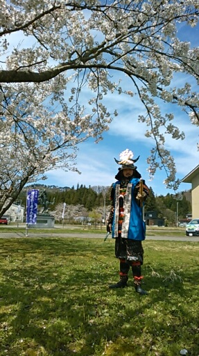 「我らが本陣でお客さまに本丸登城を進めている拙者ですが最近、登っておりませぬ~(汗)!さて、本日は゛ガッツポーズの日!それぞれの挑戦で元気な笑顔に~(願)!加えて、疲れた時は、や~×3と、永遠の二十歳、拙者の十吾郎ジャンプをぜひ!もちろん、疲れた時は観桜会~」