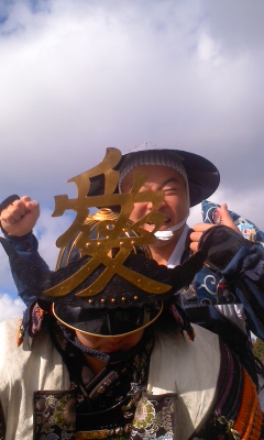 大きな大きな声で、元気な笑顔をお届けいたします(のつもりで…)、調子に乗って「ボツ」になった写真(一昨日の少〜し青い空)を出して来ました拙者、お顔が見えない我らが兼続様の後ろに見え隠れしている控え目な!?足軽組頭、十吾郎にござりまするっ!