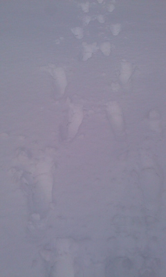 我らが兼続様の足跡と、昨日も楽しく(いや真面目に)お仕えいたしました拙者の足跡を「ぱしゃり」撮ってもらいました。さて、問題です。片や、「完全防水地下足袋」、片や、ずる〜い「ブーツ」ですが、左右どっちがどっちでしょうか!(後の雪で見ずらいですね…)