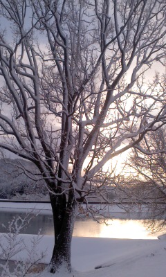 落葉高木の椚(クヌギ)『お〜十吾郎が私のところにも写真を撮りに来たか〜!朝陽は昇ったぞ、ほんに遅すぎだね〜!ほら、羽を休めている鴨たちにも笑われておるぞっ!さておき、雪国の元旦に朝陽、青い空、ありがたいな〜!今年は、いい年になるぞ〜』