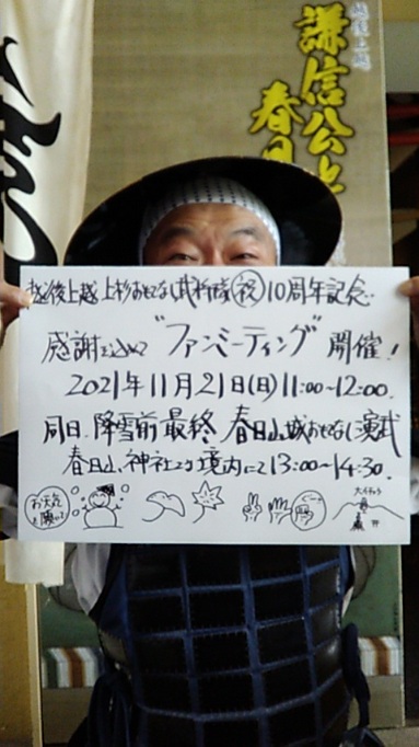 ※来る21日(日)は、2021年の降雪前最終となる゛春日山城おもてなし演武!です。そして、武将隊10周年記念フアンミーティング!よろしくお願いします。お天気を願いて!十吾郎(礼)