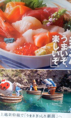 「レルヒさん」や「ブリカツくん」等がその佐渡の「たらい舟」に乗って越後を宣伝している下の文字には「上越新幹線で、うまさぎっしり新潟へ〜」とありまするが、ご存知の通り、一年半を切りました「北陸新幹線」も開業いたしまする〜