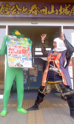 ※来週末開催「大潟かっぱ祭り」の宣伝に真夏日を押してかっぱさまが本陣に…。やっぱり笑顔は元気な源です〜