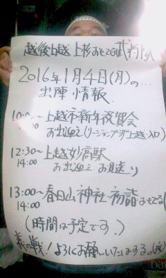 十「今年は申年…。いろいろな猿(さる)を考えてみました…。前記の¨渡り鳥さんたちが遠く北の国に旅立つ、当市を去る(さる)のは3月です。寂しくなりまするが、北陸新幹線が♪び〜ゅんと開通して早くも一年、我らが上越妙高駅開業一周年を記念して¨食の催しが3月12日(土)13日(日)、我らがお館様の懸垂幕や旗がいっぱいな同駅で開催されまする〜」