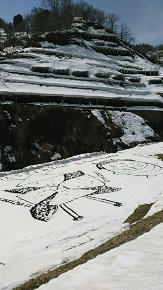 「2月の最終土曜日の夜、大感動の雪と灯りの共演は゛灯の回廊の舞台のひとつ、大島区の庄屋の家から程近く。今年も籾殻燻炭を活かした゛残雪アートが現れています。小さな集落の大きな取り組み…。山里にも春がやって来ます~」