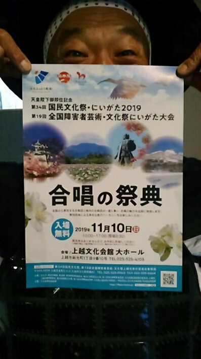 「国民文化祭!北陸新幹線を利用され遠方から我らが上越妙高駅に前乗りされた二団体さまに昨日の公開生放送゛ナマ・ステでお会いしました。本日は、上越文化会館で合唱の祭典です!あっ、残念ながら拙者の美声の出番はありませぬが~(汗)!」