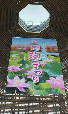 ※我らが上越妙高駅の東口は¨越後杉がふんだんに組まれた¨もてなしドームに¨上越蓮まつりの大きな懸垂幕が出ました。