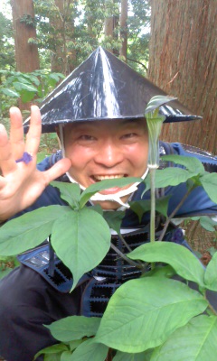 十「道中幅が狭いゆえ、鉄馬、鉄駕の方は無理せず春日山神社¨石段下の駐車場に留め置きください。御母上様のお屋敷があったとされる地に明治34年に創建された¨謙信公が御祭神¨春日山神社さまに御参拝、謙信公のお屋敷があったとされる郭に向け、足下と¨ちと怪しき¨マムシグサ(画像)に気を付けて下り、お屋敷を通り抜け、用水池の堤防を渡り、右に降りれば謙信公が幼き頃に学んだとされる林泉寺さまと続きまするが、ここは左に用水池の脇を上がります。後はひたすら決して怯むことなく進む。小さいですが案内標示あり、駐車場から徒歩30分は見ておいてくだい。事前に麓から春日山を望むと右の山に見える電波塔の近くです。」