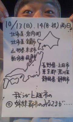 「では、七五三繋がりでお知らせを…。今週末は、七つの姉妹都市さまが集結されての、秋の恒例〜観光と物産展〜が上越観光物産センターさまにて開催されまする〜」
