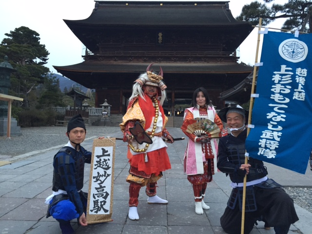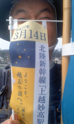 十「上越、妙高、糸魚川¨上越地域を走ります信越本線は¨妙高はねうまライン¨に、北陸本線は¨日本海ひすいライン¨として¨トキ鉄¨さまが新たな旅立ちですっ!お館様の居城¨春日山¨をくっきり望めまする春日山駅をはじめ、各駅でもお祝い一色!その¨はねうまラインに乗って¨上越妙高駅に〜!かっこいい〜お館様の騎馬像!そして10時から予定の¨巨大謙信公ギャザリングアート¨完成除幕式は必見です!お館様がお声掛けし¨日ノ本各地ゆかりの武将様が大集結なされますっ!」