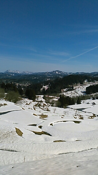 ※ごんぞ飛ばしの聖地、旧原小学校周辺は、残雪に早咲きの桜がありがたいそうです…(画像は、牧区の大月の棚田)。一方、第94回高田城百万人観桜会の高田公園では、ぼんぼりの設置が始まりました…。広~い我らが越後上越です~!十吾郎(礼)