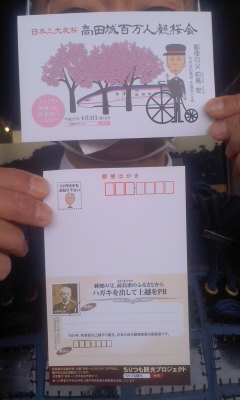 十「で、恒例の¨ちりつも観光プロジェクト¨は、第13弾¨春編¨の観光情報ハガキとして、3月14日(土)開業する北陸新幹線¨上越妙高駅¨と4月3日(金)に開幕する¨高田城百万人観桜会¨を、生誕180年を迎える上越出身で¨郵便の父¨前島密さまを元に考案されたキャラクター¨ひそかさん¨が案内されています。¨日ノ本一葉書を出すまち¨を目指し活動を続けている市民団体さまの企画で、市内の主な郵便局で配布しています。」