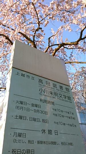 「思いを声に!夢は見るもの実現するもの!ですが、週刊゛十吾郎~は流石に拙者も見たくないです~(汗)!さておき、本日は゛図書館開設記念日。1872(明治5)年、東京の湯島に日ノ本初の官立公共図書館が開設された日!だそうです…。我らがふるさと越後は新潟県上越市!謙信公が御祭神、春日山神社さまゆかりの童話作家、日本のアンデルセンと称されるは゛小川未明さま!小川未明文学館を併設した高田図書館(添付画像は3月31日です)。第95回観桜会゛開催中の高田城址公園にありまする。一方、日本海側で、新潟県鉄道発祥の地、直江津駅前に建つ直江津図書館は、鉄道関連の資料も展示されている゛なおえつ学びの交流館に。正直、本には゛ほんに無縁の拙者ですが、時に忍んで足を運ぶ両館にござりまする~」