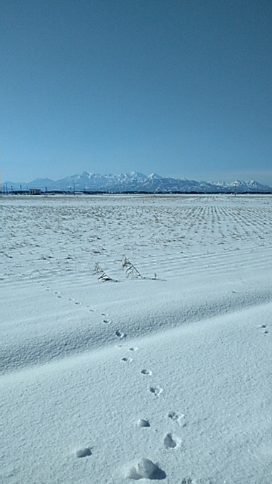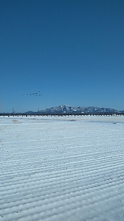 ※青い空と一面白の写真は保存されず、朝焼けは寒さで一気に充電切れ…。雪の田んぼに白鳥さんたちの姿は分かりますかな。あ~(汗)!新たな年もガラ携の写真です(が)、お付き合いくださりませ!其々の元気な笑顔を願いて~!十吾郎(礼)