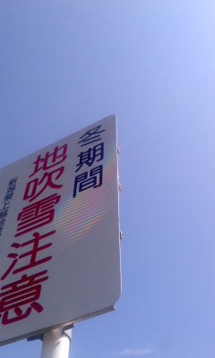 「地吹雪注意」の看板が青い空に映えています。