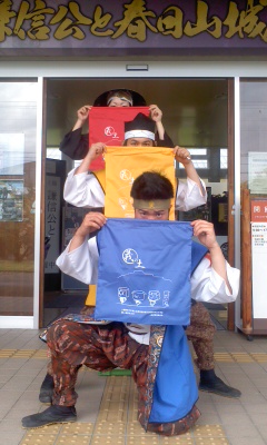 新調された陣羽織の色にあわせ、我らが景勝様、兼続様にご協力いただきました、雪国ならではの「縦」に並ぶ信号機…。