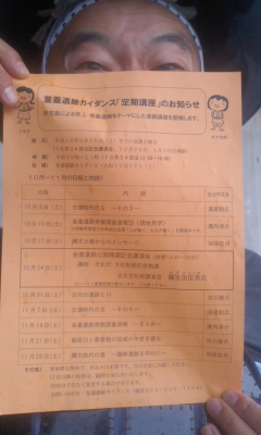 十「そして、何度か紹介しておりまする¨西口を出てすぐに広がるは、弥生時代後期からの暮らし跡¨釜蓋遺跡公園です。入り口には、出土品などの展示、まが玉作りなどの体験なども出来る¨釜蓋遺跡ガイダンス(施設)があり、毎週土曜の10時からは、学芸員さん等による無料・申込み不要の定期講座が開かれています。そして、本日までは、日ノ本東西文化の交流点と¨その物語を発掘調査で探る出土品の展示が行われているようです。ニ千年の時を超え、今まさに〜」