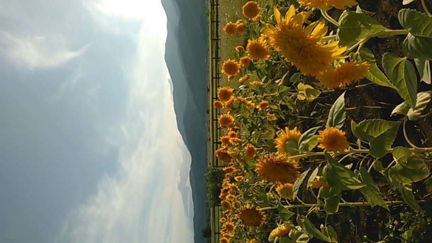 「朝市も、秋移ろいて、腹が鳴る~(汗)!」※上越妙高駅の西口前に広がる釜蓋遺跡公園の一角、お子たちも携わった向日葵が頑張っています~