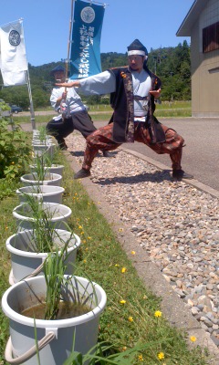 発掘調査が進む「釜蓋遺跡」、約千八百年前の暮らし跡の入り口に、「遺跡応援団」みなさまが「バケツ稲」を手掛けておられまする。(兼続様に決めていただいた画像は我らが本陣です…)