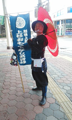 「我ら武将隊、お館様¨謙信公が春日山城を、ふるさと越後は新潟県上越市を盛り上げよう〜とこの地に甦りし六年目の寒を迎えています。頸城平野もこの時期は路面の圧雪がつるつるとなりまするが、年々寒さに抵抗力が出てきたように感じる永遠の二十歳の拙者、中華まんのようにまんまる笑顔です〜(笑)」