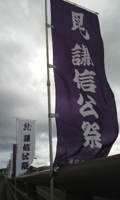 「(追記)我らが¨お館様が武録で紹介された謙信公祭ののぼり旗、青い空に映えまする。迷カメラマンは落ち込んでおりまする〜(汗)」