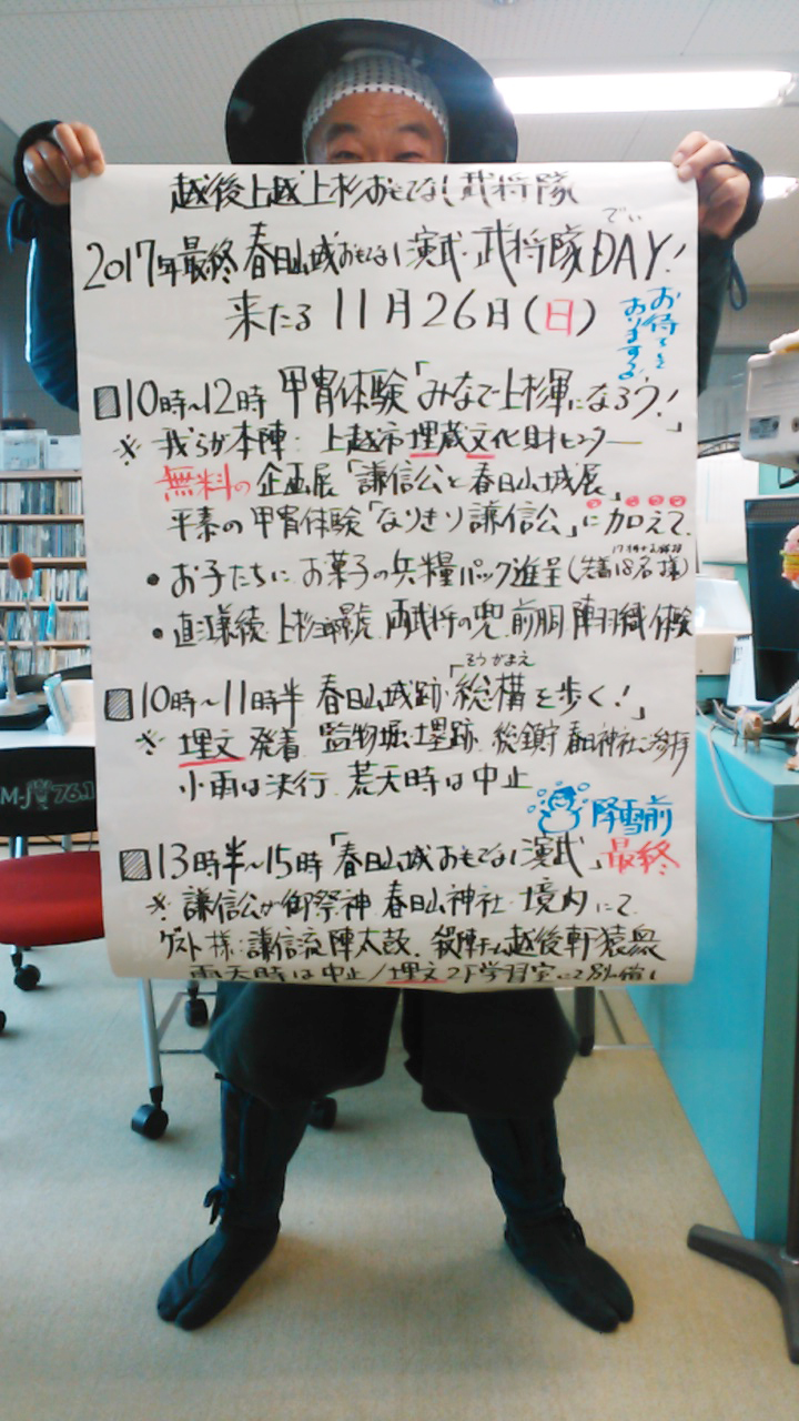 感謝感謝感謝を込めて、2017年最終゛春日山城おもてなし演武゛武将隊DAY!大開催にござりまする~!謙信流陣太鼓、越後軒猿衆のみなさまが駆け付けてくださりまする!今日も朝から荒れていますが、ただただ、お天気を願って~!十吾郎(礼)