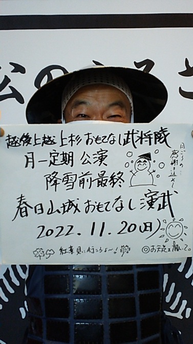 「29!我ら越後上越上杉おもてなし武将隊!初陣は、2011年4月29日(祝日)でした。おかげさまで、12年目の晩秋を迎えました。いよいよ、この20日(日)は、降雪前今年最終となる春日山城おもてなし演武(月一定期公演)です。ただただ、お天気を願いて~」