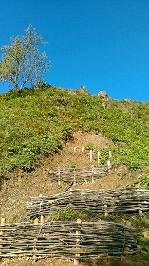 昔ながらの土留め、粗朶(そだ)が見られまする。しなやかな細い雑木を杭に編んでゆく土木普請が平成の修復工事の近くに…。人生の大ベテランさんの生きた技にござりまする~!十吾郎(礼)