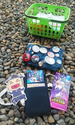 「もちろん、謙信公が春日山城跡での記念撮影には、いざっ、出陣!春日山〜!はい、十吾郎〜も〜!人物を撮る時は元気な笑顔がいいです。そのためにも、笑ってもらえる掛け声が〜(汗)!さてて、徽章、バッジと言えば、我ら武将隊の缶バッジ!数多に付いている拙者の巾着にもありまするぞ〜!今はガチャガチャで求めてもらっているので何が出るかは運次第!郷土食やご当地グルメなどの食シリーズをはじめ、訪れて欲しい場所や催し、よく見てもらえると更に越後上越を好きになっていただけるはずです。満月さんや西瓜、もはや人の域を超えた十吾郎が出た時は、ただただごめんなさい〜」