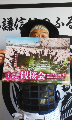 「我ら武将隊にとって五回目の春、高田城百万人観桜会を迎えます。日ノ本三大夜桜の夜はもとより、大感動の早朝や日中は妙高山や南葉山、信州との県境¨関田山脈の残雪と桜の対比を、そして、夕暮れから暗くなるまでの群青の瞬間も¨全て満喫して欲しいです。もちろん、春日山も楽しんで欲しいです〜」