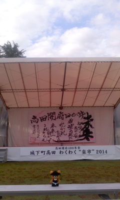 『高田開府四百年祭「わくわく楽市」の舞台、我らが「上越へ来てもらいたい」隊長バックスクリーン殿が司会を務め盛り上げておったッ!で、「♪十吾郎〜」と何度も叫んでおったぞ〜』