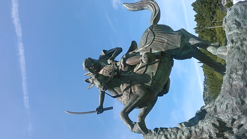 「あ、ありがたいばかりです~(汗)!さて、ニューヨークと言えば、世界を照らす自由とされる゛自由の女神像!春日山城跡と言えば、謙信公が立像!春日山の中腹、大きな空堀や馬場があったとされる地に鎮座し、旅のお土産店もあり、我ら武将隊グッズ~も置いてもらっています!昭和44年、1969年放送の大河ドラマ゛天と地゛を記念し寄贈を受け建造された銅像です。同じく築かれし石垣の上に…。銅像裏の市道は、昨年夏の記録的豪雨による被害から復旧工事により通行止めとなっていますが、銅像前広場から右すぐに建つ謙信公が御祭神の春日山神社さまの境内より尾根に沿って本丸攻め、いやいや、楽しく登城していただけまする。日本海が、我らが頸城平野が眼下に開ける春日山の本丸、そして、天守!栗が落ち始めていますぞ!秋ならではの動植物に出会え、秋の風を感じながら♪ぼ~っと過ごすも、お勧めにござりまする~」